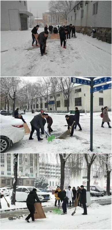 虽然是天寒地冻,但清雪现场,党员和员工热情高涨,他们团结协作,发扬不怕苦不怕累的精神,有的用铁锹清除积雪积冰,有的抡起扫帚扫起来,大家积极参与到志愿服务活动中来。经过2个多小时的劳动,手冻僵了,脸冻红了,脚也被雪水浸湿了,但大家没一句怨言,愉快的笑声、擦擦扫雪声、当当铲雪声交融在一起,汇成了一曲欢快的交响乐。目前,光电厂六号楼周边主要通道积雪已全部清理,为广大师生员工安全出行提供了有力保障。