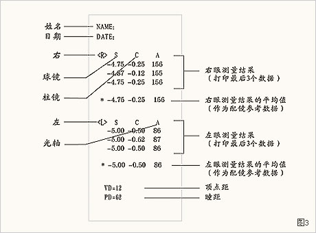 仔细调节手柄,使瞳孔环聚焦最清楚; 按一下测量按钮,稍等片刻,测量结果会显示在显示屏幕上。 按“DISPLAY显示”键,可以观察眼底圆环图像,若眼底圆环不完整,说明此次测量结果不可靠,应重新测量。再按一下“DISPLAY显示”键,便返回到正常界面。 当左、右两眼都测量完毕后,瞳距PD值也将显示在屏屏上,每只眼睛一般应该测量3次以上,测量结果更可靠。 按“VD顶点距”键,选择顶点距:VD=0,12或13.75mm。 按“PRINT打印”键,打印测量结果。(图3)