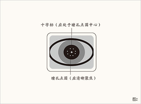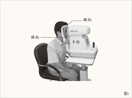 让患者把下巴颏放在颏托上,前额靠紧额托; 调节颏托升降手轮,使患者的眼睛大致与测量窗对准; 扳动并转动手柄,使十字标处于瞳孔环的中心(图2);