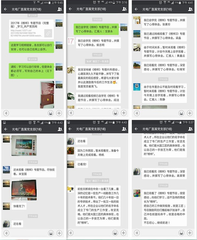 根据学校党委组织部《关于认真做好<榜样>专题节目学习工作的通知》的文件精神,光电厂党总支高度重视,于10月11日全天精心组织安排下面的3个党支部充分利用新媒体平台,组织全体党员通过微信、网络收看。